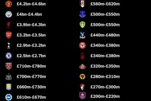 體育資訊12月27日訊 著名媒體《The Athletic》仔細(xì)研究了行業(yè)估算,查看了俱樂部最近的財(cái)務(wù)狀況,并匯總了相關(guān)數(shù)據(jù)。包括TA在內(nèi),加上Football Benchmark、福布斯、Kinnaird和Sportico的估計(jì)數(shù)值匯總,他們給出了英超20隊(duì)的價(jià)值區(qū)間。