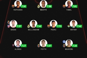 體育資訊12月27日訊 Sofascore評出了2025年西甲最佳陣容,姆巴佩、拉菲尼亞、亞馬爾組成三叉戟。