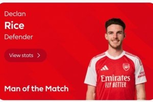 客串右后衛(wèi)收獲MVP!官方:賴斯當選阿森納2-1布萊頓的全場最佳