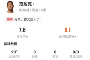 范戴克本場1造犯規(guī)+3解圍2搶斷 12長傳9成功+11對抗7成功 獲7.6分