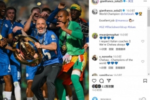 切爾西名宿佐拉社媒曬出馬雷斯卡捧杯的照片,并寫道:“世界冠軍切爾西!干得太棒了,馬雷斯卡!”