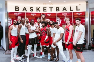 賽后,猛龍全隊(duì)在更衣室拍攝全家福慶祝勝利,斯科蒂·巴恩斯獲戴本場(chǎng)最佳球員的大金鏈子。