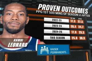 萊昂納德近四個(gè)賽季賽季500分鐘之前和之后場均得分對(duì)比: