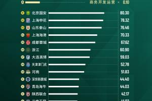 上海海港、成都蓉城 、浙江和大連英博分別位列四、五、六、七名,天津津門虎、河南位列第八和第九。