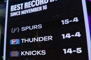 馬刺主場(chǎng)迎戰(zhàn)騎士,轉(zhuǎn)播方曬出近一個(gè)半月(11月16日至今)的戰(zhàn)績排名: