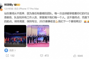 林詩棟在個(gè)人微博寫道:站在賽場(chǎng)從不孤單,因?yàn)樯砗笥凶钣驳膱F(tuán)隊(duì)。每一次擊球都承載著你們的付出。感恩教練、隊(duì)友和所有工作人員,榮譽(yù)屬于我們每一個(gè)人。這不是終點(diǎn),而是下一程的起點(diǎn)。保持渴望,保持專注,2025賽事收官,我們下一個(gè)賽場(chǎng)再見!