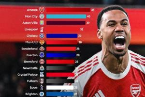 優(yōu)勢(shì)較大3隊(duì):阿森納45分、曼城40分、維拉39分