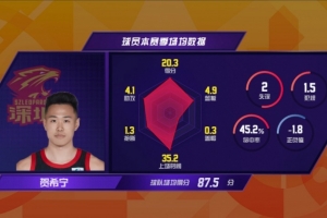 常規(guī)賽第二周周最佳球員賀希寧本場比賽發(fā)揮出色,他18次出手命中11球,得到賽季新高的29分。末節(jié)決勝時刻,賀希寧接管了比賽,他包辦了球隊(duì)最后12分中的10分。身體強(qiáng)壯的深圳后衛(wèi)先是突破造成付豪犯規(guī)打成2+1,隨后又在轉(zhuǎn)換進(jìn)攻中上籃得手。最后1分20秒,賀希寧再次突破打成2+1,當(dāng)他站上罰球線時,主場球迷高喊起了“MVP”。