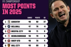 體育資訊12月31日訊 數(shù)據(jù)網(wǎng)站OPTA盤點(diǎn)了2025全年英冠積分榜,其中蘭帕德率領(lǐng)的考文垂積分92分,比排在次席的米爾沃爾多出16分,凈勝球更是高達(dá)37球。
