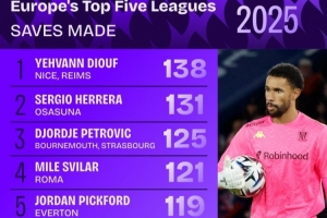 體育資訊1月1日訊 Squawka列2025年五大聯(lián)賽門將撲救次數(shù)榜,尼斯門將葉赫萬(wàn)·迪烏夫以138次居首。