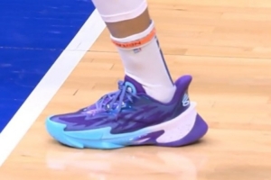 本場比賽,庫里賽前熱身環(huán)節(jié),穿回了UA,上腳了庫里品牌的旗艦鞋款Curry Series 7。