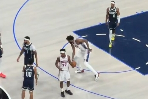 GIF-恩比德死球被砸腦袋 然后踉蹌著模仿老太太摔跤