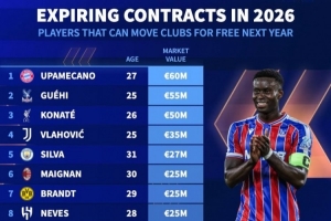 體育資訊1月2日訊 2026年已經(jīng)到來(lái),多位知名球員將在今夏合同到期,《轉(zhuǎn)會(huì)市場(chǎng)》也統(tǒng)計(jì)了今夏合同到期球員的最貴身價(jià)榜,三大中衛(wèi)包攬前三。