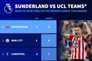 體育資訊1月2日訊 英超已經(jīng)進行了19輪,《轉(zhuǎn)會市場》統(tǒng)計了本賽季至今英超聯(lián)賽對陣上賽季歐冠區(qū)球隊的拿分情況,升班馬桑德蘭9分最高。