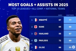 體育資訊1月2日訊 2025年已經(jīng)過去,《轉會市場》也統(tǒng)計了2025前15聯(lián)賽球員的俱樂部+國家隊各項賽事總參與進球情況,皇馬前鋒姆巴佩領跑。