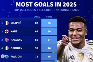 體育資訊1月2日訊 2025年已經(jīng)過去,《轉會市場》也統(tǒng)計了2025前15聯(lián)賽球員的俱樂部+國家隊各項賽事總進球情況,皇馬前鋒姆巴佩領跑。