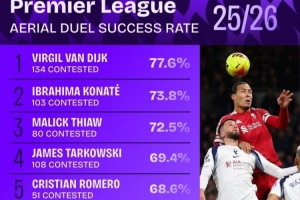體育資訊1月3日訊 數(shù)據(jù)機(jī)構(gòu)squawka統(tǒng)計(jì)了本賽季英超爭頂成功率情況,利物浦雙中衛(wèi)包攬前二。