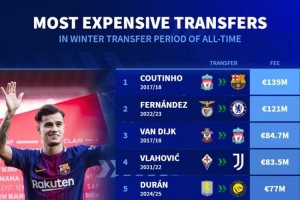 體育資訊1月3日訊 德國轉(zhuǎn)會市場列出冬窗最貴轉(zhuǎn)會排名,庫蒂尼奧1.35億歐居首。