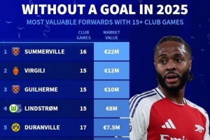 體育資訊1月4日訊 2025年已經過去,多位知名前鋒一整年均未能取得進球,《轉會市場》也統(tǒng)計了在俱樂部出場15+但0進球的球員身價榜。