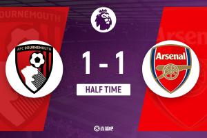 上半場傷停補(bǔ)時(shí)2分鐘,半場結(jié)束,阿森納暫1-1伯恩茅斯。