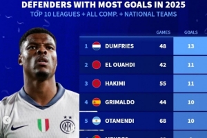 體育資訊1月4日訊 《轉(zhuǎn)會市場》統(tǒng)計了2025年前十聯(lián)賽后衛(wèi)的俱樂部+國家隊各項賽事進球最多情況,鄧弗里斯居首。