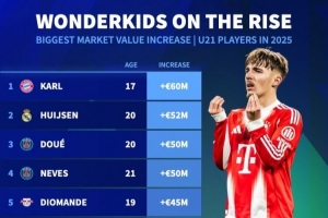 體育資訊1月4日訊 《轉(zhuǎn)會市場》統(tǒng)計(jì)了2025年U21球員的身價(jià)上漲幅度情況,拜仁小將卡爾位居榜首。