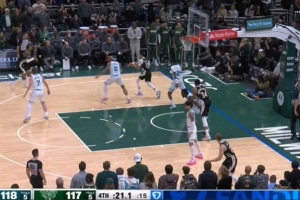 當(dāng)時(shí)裁判沒(méi)有吹罰,字母哥接球后分球給庫(kù)茲馬,后者命中反超三分!