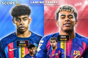 體育資訊01月04日訊 Score90曬圖,展示了亞馬爾從2023年到2026年的身高變化。