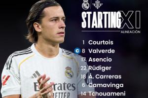 皇馬首發(fā):1-庫爾圖瓦、8-巴爾韋德、17-勞爾·阿森西奧、22-呂迪格、18-卡雷拉斯、6-卡馬文加、14-瓊阿梅尼、5-貝林厄姆、11-羅德里戈、7-維尼修斯、16-貢薩洛·加西亞