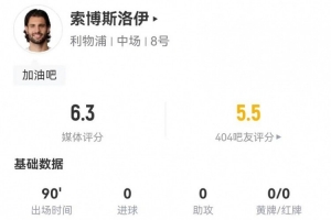 體育資訊1月5日訊 利物浦在本輪英超對(duì)陣富勒姆,索博斯洛伊本場(chǎng)客串右邊鋒數(shù)據(jù)如下:
