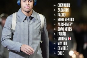 30-舍瓦利耶、6-扎巴爾尼、51-帕喬、25-努諾·門(mén)德斯、33-扎伊爾·埃梅里、87-若昂·內(nèi)維斯、8-法比安·魯伊斯、17-維蒂尼亞、24-馬尤盧、10-登貝萊、14-杜埃