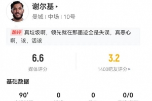 體育資訊1月5日訊 曼城在本輪英超1-1戰(zhàn)平切爾西,謝爾基本場數(shù)據(jù)如下: