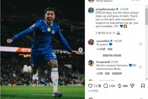 恩佐社媒曬出慶祝進球的照片,并寫道:“艱難的時期,但這支球隊總能挺身而出,拼盡全力。感謝無論我們?nèi)ネ翁幎紒淼浆F(xiàn)場支持的球迷們,你們太棒了。”