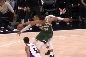 被頂飛了!狄龍防守阿門被撞倒四腳朝天 后者輕松上籃得手