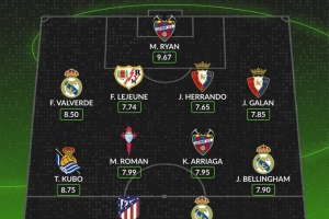 后衛(wèi):費(fèi)德里科·巴爾韋德(皇家馬德里,8.50分)、弗洛里安·勒熱納(巴列卡諾,7.74分)、豪爾赫·埃蘭多(奧薩蘇納,7.65分)、哈維·加蘭(奧薩蘇納,7.85分)