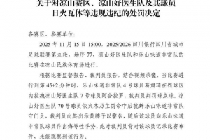 四川省足協(xié)今日對(duì)外公布了11月15日川超比賽涼山隊(duì)和對(duì)裁判實(shí)施暴力行為致使裁判受傷的涼山隊(duì)球員日火瓦體的紀(jì)律處罰決定,決定落款時(shí)間為12月30日。其中日火瓦體被禁賽5年,在四川省足協(xié)管轄范圍內(nèi)生效,并將抄送中國(guó)足協(xié)備案。
