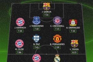 WhoScored五大聯(lián)賽2025年最佳陣容(聯(lián)賽場均評分)