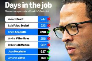 近13位切爾西正式主帥中,超過(guò)半數(shù)未能執(zhí)教滿1年,穆里尼奧是這期間在任時(shí)長(zhǎng)最久的主帥。