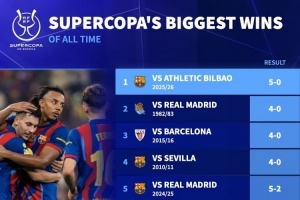 體育資訊1月8日訊 西超杯半決賽,巴薩5-0大勝畢爾巴鄂競技。德國轉(zhuǎn)會市場統(tǒng)計了西超杯歷史最大比分勝利,并列出榜單,巴薩5-0畢巴居首。