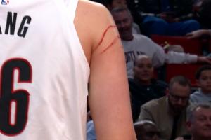 下場后隊(duì)醫(yī)給楊瀚森清理下傷口