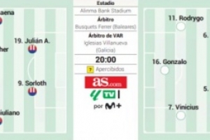 體育資訊1月8日訊 北京時(shí)間1月9日3點(diǎn),西超杯半決賽,皇馬vs馬競(jìng),《阿斯報(bào)》賽前預(yù)測(cè)雙方首發(fā),貢薩洛對(duì)決阿爾瓦雷斯,維尼修斯、貝林厄姆出戰(zhàn)。