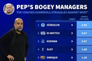 體育資訊1月8日訊 德國(guó)轉(zhuǎn)會(huì)市場(chǎng)統(tǒng)計(jì)了瓜迪奧拉對(duì)陣不同教練的場(chǎng)均積分,并列出瓜帥克星榜單,赫爾澤勒居首,斯洛特、克洛普、阿莫林在列。