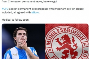 報(bào)道稱切爾西接受了包含重要二次轉(zhuǎn)會(huì)分成條款的永久轉(zhuǎn)會(huì)提議,所有細(xì)節(jié)已與米德?tīng)査贡み_(dá)成一致。球員的體檢將在近期進(jìn)行。