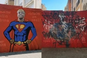 在原本的畫作中,亞馬爾被描繪成超人形象,胸前的S換成了L,并配有“當(dāng)意志堅(jiān)定時(shí),障礙微不足道”的標(biāo)語(yǔ)。不幸的是,位于埃斯科里亞爾街的作品現(xiàn)在幾乎完全被黑色和白色顏料覆蓋。