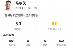 體育資訊1月9日訊 利物浦在本輪英超對(duì)陣阿森納,維爾茨本場(chǎng)數(shù)據(jù)如下: