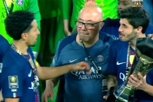 賽后慶祝時(shí)發(fā)生了有趣的一幕,隊(duì)友們輪流捧起獎(jiǎng)杯,而巴黎邊衛(wèi)努諾·門(mén)德斯與資深裝備管理員納賽爾丁開(kāi)玩笑,多次把后者的光頭當(dāng)作獎(jiǎng)杯捧起。