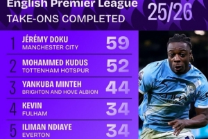 體育資訊1月10日訊 squawka統(tǒng)計了本賽季英超成功過人情況,多庫力壓庫杜斯居首。