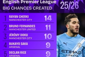 體育資訊1月10日訊 數(shù)據(jù)機構(gòu)squawka統(tǒng)計了本賽季英超創(chuàng)造重大機會情況,謝爾基力壓B費居首。