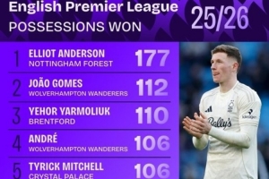 體育資訊1月10日訊 數(shù)據(jù)機(jī)構(gòu)squawka統(tǒng)計(jì)了本賽季英超贏得球權(quán)情況,諾丁漢森林中場(chǎng)埃利奧特·安德森獨(dú)自領(lǐng)跑。