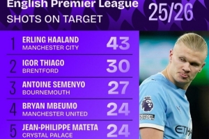 體育資訊1月10日訊 數(shù)據(jù)機構(gòu)squawka統(tǒng)計了本賽季英超射正情況,哈蘭德居首。